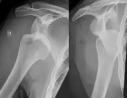 - ^ Auffarth A, Mayer M, Kofler B, Hitzl W, Bogner R, Moroder P, Korn G, Koller H, Resch H (Nov 2013). "The interobserver reliability in diagnosing osseous lesions after first-time anterior shoulder dislocation comparing plain radiographs with computed tomography scans". J Shoulder Elbow Surg. 22 (11): 1507–13. doi:10.1016/j.jse.2013.04.020. PMID 23790679.