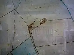 Armstrong's map of 1775 shows a building marked as 'Mains' with a fairly substantial ruined castle close by. It is not marked as a ruin, however the identical image as for the ruined Giffin Castle is used. Nearby estates have a 'mansion house' symbol used.[17] Dobie states that the castle's stones had been mainly removed by the middle of the 18th century.[9] The 1832 map no longer marks the castle site or its formal access.[18]