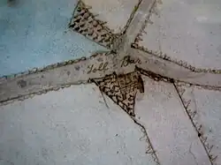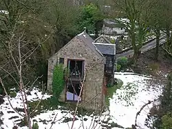 The water-mill of the Barony of Hill of Beith stood on the Muir or Roebank Burn at Mill of Beith (NS 366 559) where there is a linn or waterfall, called the 'Warlock Linn' or 'Warlock Craigie'.[26] The present day Mill of Beith dates from the late 18th to early 19th century, being a small rectangular rubble built building with an offset square kiln. The lower part of the wheel splash wall is faced with ashlar. The wheel was mid breast, about 3 ft (0.91m) wide by 16 ft (4.88m) diameter, and was fed from a dam on the burn which ran through a lade under the road running to the mill.[27] The ruins of the Davies o'the Mill, once home to Dugald Semple, stand nearby down the old lane that has now been blocked off.