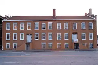 The two-storey rectangular structure houses apartments that are symmetrically arranged along interior corridors.[3] The north wall is composed of stone laid in ashlar fashion and covered in stucco. There are rough irregular shaped stones on the basement level and on the upper two floors of the main façade. The north side of the façade features stone pilasters with mock capital wood crowns that flank the entranceway. The northeast corner has stone quoins. The sidewalls and one in the middle are stepped at the top and the structure is topped with a gabled roof. For the most part, the interior retains its original layout and woodwork, including staircases.[4]