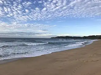 Hills Beach (also known as Opal Cove Beach) is a beach on Korora Bay, located in the city of Coffs Harbour, New South Wales.[1] It is a steep, reflective beach, around 600m long.[1] At its southern end, Hills Beach is bounded by rocks separating it from the neighbouring Korora Beach.[1] Also near the southern end, there is a small creek crossing the beach and a sandy tombolo stretching out to rocks in the sea.[1][2] At the northern end, the beach is bounded by Pine Brush Creek, which has an intermittently open entrance to the sea, and by steep rocks which separate it from the small (150m long) secluded Hills North Beach.[2][3] The sea off the beach is part of the Solitary Islands Marine Park and is a Habitat Protection Zone.[4] The Solitary Islands Coastal Walk, which goes from Red Rock to Sawtell (60 km), runs through Hills Beach.[5]