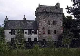 The main tower has a footprint of 30 feet (9.1 m) by 24 feet 3 inches (7.39 m), and its walls, which are up to 4 feet 6 inches (1.37 m) thick at the base, rise to a height of 45 feet (14 m) to the level of the parapet.[2] It has a single door, on the ground floor, giving access to the house from the courtyard; grooves remain in the stonework for the iron yett that would originally have protected the entrance.[2][3] Above the door is an armorial panel, which bears the worn initials of Edward Maxwell, who had the tower built, and his wife Janet Corsane (or Carson).[2][3] The door enters into a small vestibule, from which leads a turnpike stair, and a door into the vaulted basement, which would originally have been a store room; a fireplace was built into it in the twentieth century.[4]