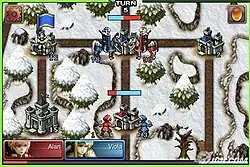 Capturing bases is done by comparing the attacking troops' numbers with the defending, with larger numbers winning. Bases come in several varieties, and some bases, such as mines and castles, provide additional bonuses to the side that holds them, such as increased movement speed or attack power. Other bases, such as ports, form choke points on the map by allowing travel on other terrain such as over water. When a base is captured, it has a chance to give the capturing side an item, which may be consumed later to grant a bonus, such as increased speed or defense, to all the units of that side.[4] The match ends when one player controls the entire map.[1] Each match takes around ten to twenty minutes to complete.[3] Some battles feature more than one enemy player. In addition to the campaign mode, which is ten missions long, there is a free-play mode where the player can fight enemies on the map of their choosing.[5]