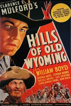 Hills of Old Wyoming is a 1937 American Western film directed by Nate Watt and written by Maurice Geraghty, the 10th film of the 66 Hopalong Cassidy movies.[1] The film stars William Boyd, George "Gabby" Hayes, Morris Ankrum, Russell Hayden, Gail Sheridan, John Beach and Clara Kimball Young, Russell Hayden makes his first (of 27 consecutive) appearances. The film was released on April 16, 1937, by Paramount Pictures.[2][3]