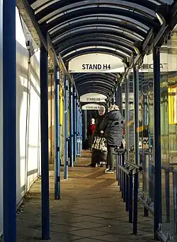 The bus station is located adjacent to the travel centre. Stand H1 is adjacent to, but set back from, Langsett Road, with stands H2 and H3 line with this. Stands H4 and H5 have the same continuous shelter and run at 45 degrees from the travel centre to the cycle parking at rear of the bus station. Stand H6 is located opposite stands H4 and H5. A further two bus stops are located next to the Interchange directly on Langsett Road.