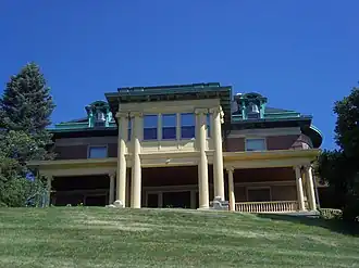The 2½-story mansion is a brick structure built on a limestone foundation. It follows a rectangular plan that features projecting semicircular bays or rectangular pavilions at the corners on the east and west sides. The home features a porte-cochere on the north side and porches on the east and west sides of the building. There is a porch that faces the south side that runs the length of the house whose floors are of hand-made mosaic tile. There is also a two-level projecting pavilion; the upper part of which was enclosed in the 1920s. The front columns are 30 feet (9 m) in height and feature fluted Ionic capitals. All of the secondary columns on the house are 15 feet (5 m) high.[4] The structure is capped by a decked hipped roof with roof dormers that feature semicircular pediments above round arch windows. At the roofline is a copper cornice. The interior of the home features many of original architectural features, which include stained glass, three fireplaces, tapestry walls, pocket doors, and mahogany woodwork. The house is situated on a corner lot at the top of a bluff with a commanding view of the river.