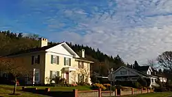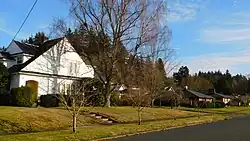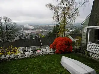 Pioneers and founding members of the city owned residences, or plots, on the hillside. The home for the matriarch of Chehalis, Eliza Saunders, was near the intersection of Market and Main Street.[13] Approximately half of the lots on Washington Avenue were owned by William Muir Urquhart, a banker, merchant, and long-serving civil servant in the city.[2] Other prominent homeowners included family members of the Chehalis mint company I.P. Callison's & Sons,[14] the banker N.B. Coffman, the attorney Daniel Millett of Millett Field fame, the coal and timber baron T.C. Rush,[9] the mercantile Saindon brothers, and the Sticklin family noted for their funeral parlor.[7][15][16] As the years passed into the Roaring Twenties, other notable persons, such as state senator A.E. Judd, continued the history of distinguished residents to call the hillside home.[17]