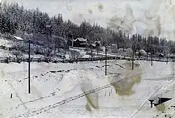 Beginning in 1888, the first streets built on the hillside were Adams, Jefferson, and Washington, named by the CL&T after the first presidents in the United States after the Washington territory was granted statehood. Early residential development began in 1890 but only a few homes, scattered amongst the hillside, had been built in a few years. The southern portion of the hillside was rapidly developed between 1905 and 1910.[2] Initial infrastructure construction to provide a residential area on the hillside included a sewer system in 1906[7] and there were several road builds and improvements, such as the completion of Cascade Avenue from the main thoroughfare of Market Street to the hillside.[8] A reservoir existed during this time that supplied water to the city, fed by the Newaukum River.[9] A replacement reservoir, constructed out of wood, was built in 1928 to provide water specifically for hillside residents. The holding area was capable of containing 100,000 US gallons (380,000 L; 83,000 imp gal).[10][11] The hill was a location of an wireless telegraphy station, operational and in use as late as 1909.[12]