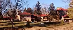 In 1932, Wright was able to use the Hillside Home School building for his newly established Taliesin Fellowship (now the School of Architecture at Taliesin[6]). He and his apprentices in the Fellowship converted the old gymnasium on the west side of the original Hillside Home School structure into a theater. On the north end of the original Hillside Home School structure, he added a large drafting room with dormitories on either side (left).[7][8] The original theater was re-designed and reconstructed after the original one was destroyed by fire in 1952 (rebuilt theater, lower left).[2]: 234
