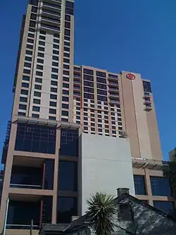 The Hilton Austin Hotel is the third largest hotel in Austin, with 801 rooms.[1] The Hilton Austin is also the sixth tallest hotel and twenty-eighth tallest building in Austin, Texas at 377 ft (115 m) tall with 26 stories.[2] Designed by Ellerbe Becket Inc and Susman Tisdale Gayle Architects (now STG Design, Inc), the building broke ground on July 10, 2001, and topped out officially on January 17, 2003, a span of 1 year, 6 months, and 7 days.[2][3] In 2018, a $7.5 million overhead walkway was constructed to connect the sixth floor of the hotel with the fourth floor of the Austin Convention Center.[4]