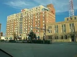 The Hilton Garden Inn is a 120-foot 11 story high-rise hotel in the downtown Cleveland Gateway District.[1] It is postmodern in style and has a color scheme of light red and beige. The Hilton is very squat in structure and occupies over a city block of space length wise, however, width wise it is very thin. It is connected to the Gateway Conference Center. The hotel features 240 rooms and sits directly across the street from Progressive Field which is the home of the Cleveland Guardians.[2] It opened in 2002.[3] It was one of the first major new hotels constructed in the central city area of downtown in the new millennium. It is one of four Hilton hotels in Cleveland, the other four being the Hilton Cleveland Downtown Hotel, the Double Tree Hotel Cleveland, and the Hampton Inn (Cleveland).