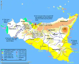 In 409 BC the prosperity of the city was brought to an abrupt end by the great Carthaginian expedition to Sicily. The ostensible object of the expedition was the support of the Segestans against their neighbours, the Selinuntines. The Carthaginians, though, had greater ambitions. Immediately after the destruction of Selinus, Hannibal Mago, who commanded the expedition, hastened to turn his arms against Himera. That city was ill-prepared for defence; its fortifications were of little strength, but the citizens made a desperate resistance, and by a vigorous sally inflicted severe loss on the Carthaginians. They were at first supported by a force of about 4000 auxiliaries from Syracuse under the command of Diocles, but that general feared for the safety of Syracuse itself and abandoned Himera, leaving the unfortunate citizens to contend singlehanded against the Carthaginian power. Their defenses failed and the city was soon taken by storm. A large part of the citizens were killed and at least 3000 of them, who had been taken prisoners, were put to death by Hannibal as a sacrifice to the memory of his grandfather Hamilcar.[15] The city itself was utterly destroyed, its buildings razed to the ground, and even the temples themselves were not spared.