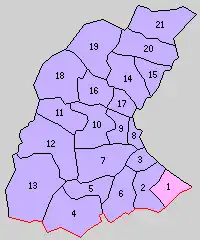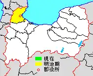 * yellow - areas formerly within the district borders during the early Meiji period