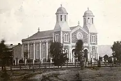 A block near the centre of the east side of Hindmarsh Square was purchased for £700 and in the first year the congregation raised £1,030 towards a new building, which was matched by Peacock. George Abbott (who also designed the first Clayton Congregational Church and the Flinders Street Presbyterian Church, died 3 April 1869) was the selected architect and English & Brown (also known for Chalmers/Scots Church) the builders. Abbott's design, described as "modified Byzantine", provided for a pair of steeples, which the committee decided to do without, as an economy measure.[4] The cornerstone was laid by Peacock on 21 August 1861 and new building, built to seat 450 and with its schoolroom and vestries completed a year later, cost £5,075. Extensive stabling was erected to the south of the building, which was to have been called the Ebenezer Congregational Church,[1] but that was rarely observed, invariably being referred to by its location. The first service was held on Friday 5 September 1862, conducted by Revs. J. Jefferis and H. Cheetham.[5]