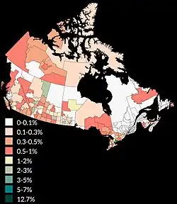 The Hindu population percentage in Canada by federal electoral district according to the 2021 Census.[7]