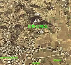 Hinoe Castle is located on a hill near the mouth of the Arima River, almost in the urban center of Minamishimabara. The site is at the tip of long ridge continued southward from Mount Unzen, at the south coast of the Shimabara Peninsula. The Arima River flows to the south, and the Ote River flows to the east. The existing castle is a mountain castle from the Sengoku period, with many enclosures arranged in a stepped pattern around the main citadel. The main body of Hinoe Castle extended over an area 400 by 200 meters, separated from connecting ridge by valley. The core area of the castle was the eastern half, and consisted of the central enclosure at highest point on the hill, the secondary enclosure to southeast and the third enclosure to the west. Another peak at western half of the hill was used as a frontal fortification protecting the castle from the castle town, and numerous terraces were also built surrounding these areas. The main gate is presumed to be on the east side, and the remains of a staircase stretching over 100 meters that reaches all the way to the bottom of the main enclosure.[2]