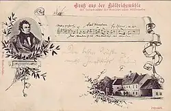Höldrichsmühle, an old mill, is a hotel in Hinterbrühl that was featured on the 24g Austrian definitive stamp of 1945 (SG936). Höldrichsmühle was a regular subject for postcards from the late 1890s onwards. Many of these cards claim an association with the composer Franz Schubert, and there have been various plaques and internal features in support of these claims. Early postcards claim that Schubert wrote Die schöne Müllerin here, later cards claim that it was Der Lindenbaum (from Winterreise). There is no documentary evidence to support these claims, though there is a claim in Deutsch's Schubert: Memoirs by his friends[4] made by Hermann Rollett in 1897 that he had seen Franz Schubert at Höldrichsmühle around 1825 or 1826, when Rollett was aged seven.