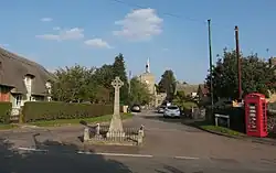 Village centre: memorial cross, mini-library in a red telephone box, and the parish church | |