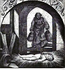 The Hinzelmann rarely manifested itself, but when it did visibly appear to young children and a half-wit, it assumed the guise of a young child wearing a red samite (thick silk) jacket, with blond (yellow) curly locks of hair reaching the shoulders.[64] In one anecdote, he showed his true form to a maid, who fainted; it was a corpse of a child around three years of age,[q] stabbed in the chest by two knives (cf. fig. right[p]). She fainted and needed to be revived by splashing the pails of water she was instructed to bring.[65] However, the hats and the knife-struck child anecdote is common to the legends of kobolds by other names.