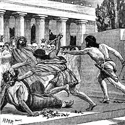![]() Death of the tyrant Hipparchus, by the Syriskos Painter, 475–470 BC | |