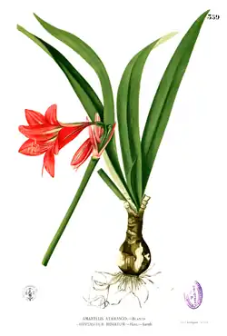 Herbert's fourteen species included this Hippeastrum equestre.[31] This 'equine' connection refers to Carl Linnaeus the Younger who had named (in an unpublished manuscript) a West Indian species as Amaryllis equestris, because of its similarity to the African genus Amaryllis. This name and attribution was first published by William Aiton in 1789, in his Hortus Kewensis.[32] Which species this was is not known precisely. However, in 1795 William Curtis, described Amaryllis equestris or the Barbados lily in his Botanical Magazine, referring to Aiton: