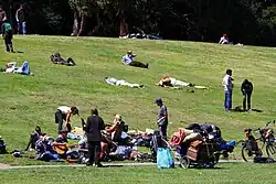 Hippie Hill is a small hill and historic area within Golden Gate Park, San Francisco. It is situated between the Conservatory of Flowers and Haight Street. Positioned east of the Golden Gate Park tennis courts, this green space features a gentle sloping lawn located off Kezar Drive. It provides views overlooking Robin Williams Meadow and is bordered by Eucalyptus and Oak trees on either side.[1][2] Notably, the hill is home to several uncommon tree species, including coast banksia, titoki, turpentine, and cow-itch.[3]
