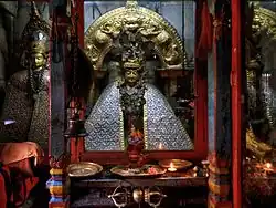The Shakyamuni Buddha, locally also known as Kwabaju, is a large silver image, covered entirely with drapes and ornaments, except for the face. In the shrine are several other figures. Most notable is the small figure of Balarama, the elder brother of Krishna, although some claim it is actually Vajradhara, the primordial Buddha.[10][4]