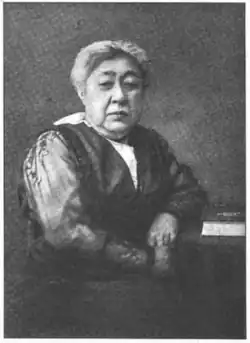 In 1911, Hirooka Asako converted to Christianity. She wrote for popular women's magazines, with the signature line, "nine times falling, nine times rising again." She spoke at church-run events.[3] She was one of the leaders of the YWCA Summer Conference in 1912, with Kawai Michi, Emma Kaufman, and several others.[4] At her summer home near Mount Fuji, Hirooka kept a retreat house for Christian preachers.[5]