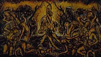 Hiroshima Nagasaki One-Minute is the subject of two mural-scale paintings made by Nabil Kanso in 1978–79. One is titled 49-Second (Hiroshima) done in oil on canvas measuring 3 by 5.50 meters (9.8 ft × 18.0 ft), the other 11-Seconds (Nagasaki) oil-on-canvas triptych measuring 3 by 4.60 meters (9.8 ft × 15.1 ft) center, and 2.75 by 1.32 meters (9.0 ft × 4.3 ft) each side.[1]