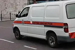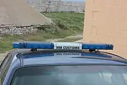 HM Customs have marked road vehicles for customs duties, fitted with blue flashing lights and sirens. The current vehicles are dark blue, with blue and yellow markings and the HM Customs crest as well as appropriate wording.[9]