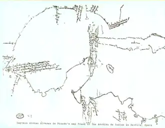 The first European to see Texas was Alonso Álvarez de Pineda, who led an expedition for the governor of Jamaica, Francisco de Garay, in 1520. While searching for a passage between the Gulf of Mexico and Asia,[4] Álvarez de Pineda created the first map of the northern Gulf Coast.[5] This map is the earliest recorded document of Texas history.[5] Moreover, the area of present-day Texas was claimed by Spain at this time.[6]