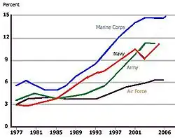- ^ Segal, Mady Wechsler; David R. Segal (October 2007). "Latinos Claim Larger Share of U.S. Military Personnel". Population Reference Bureau. Archived from the original on 2007-11-17. Retrieved 2008-05-21.