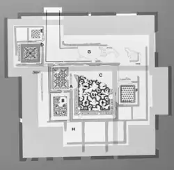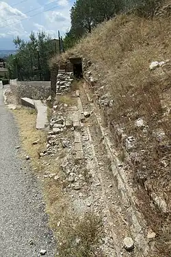 A sanctuary of the Augustan period, which included a grandiose theatre-temple-amphitheatre complex, is located partially in the grounds of the Renaissance-style villa Fidelia to the northwest of the city.[19] Geophysical surveys have allowed reconstruction of the sanctuary and its relationship to the theatre. The sanctuary occupied the area near the bottom of the Spello hill facing west as part of a scenographic layout. Three terraces were created to support the villa, two of which with mighty walls in Roman concrete (opus caementicium) covered with opus vittatum, which supported the lower terraces are still visible. The second terrace contains the present "Italian" garden and Villa Fidelia itself, which overlaps the lower terrace. The lower wall has remains of a large central nymphaeum and a quadrangular niche. Of the upper wal,l only the internal part in opus caementicium remains.