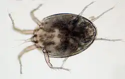These mites are characterized by a very small size (about 600–900 μm in length) and a close association to arthropods, mainly insects. A morphologically specialized instar, the deutonymph (earlier "hypopus"), is adapted to attach to arthropods for phoretic transport from one habitat to another. The mites use various insect groups as phoretic carriers[2][3] such as beetles, flies and Hymenoptera (ants, bees and wasps). In all species, the digitus mobilis of the chelicera is reduced to small rests, and the distal pedipalp article is connected to a more or less complex membranous structure. These mouthpart modifications form an organ to feed on bacteria.[4]