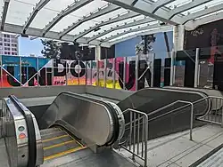 The station's glass entry pavilion is wrapped in Andrea Bowers' The People United (“El pueblo unido jamás será vencido,” Sergio Ortega and Quilapayun; “Brown Beret 13 Point Political Program,” La Causa) which features text artwork of revolutionary slogans such as “El pueblo unido jamás será vencido” (the people united will never be divided) and “By independence we mean the right to self-determination, self-government and freedom.”