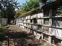 By the early nineteenth century and extending into the middle of the twentieth century, various types of wall tombs were constructed. These included oven tombs, wall vault tombs, and block vault tombs, which were architectural variations of single-burial chambers constructed along the walls at the periphery of the cemeteries or else on free-standing cemetery buildings. The various types of wall tombs generally had individual chambers stacked on top of one another, usually four chambers high. At times, the deceased in any given chamber could be replaced with another. Some of these were society tombs.[2]: 194–96