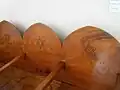 “The monumentality of the bimah (sort of pulpit) is impressive, undoubtedly the most elaborate of those existing in Mexico, placed in the center in the Ashkenazi fashion. It is made of richly carved wood with cut glasses describing musical instruments: drum, harp, zither and lute, as well as recurring Jewish symbols: the talit (religious shawl), palm leaf, citron and the Star of David among sacred prayers.“