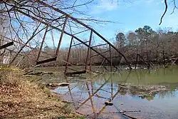 Formerly Jones Ferry. Jones Bridge spanned the Chattahoochee River from 1904-1922, falling into disrepair in the 1930s. Most articles report that half of the bridge was "stolen" sometime in the 1940s; however, aerial photography appear to show that the theft occurred between 1955-1960. Both trusses were still visible in the 1955 aerial photograph but not in a 1960 aerial photograph. Neighbors didn't know the workers cutting the bridge were not authorized to do so until it was too late. There are no reports of the culprits having been identified or caught. The bridge finally collapsed into the Chattahoochee River on January 25, 2018.