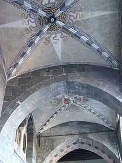 Prior to the construction of the city walls in the 12th century (known as the Barbarossa walls, with a perimeter four times as large as the previous ones),[73] three zones were distinguished in the city: the castrum, i.e., the area of the initial settlement around Sarzano; the ripa area, where traffic and activities related to the port took place; and finally the burgus, outside the walls, where the first cathedral was located, the church of San Siro, which still exists today, although it has been partially destroyed and rebuilt several times.[74] The construction of the walls, in addition to incorporating the peripheral area of the church of San Siro into the city, also included the area (closer to the previous circle of walls) of the Basilica of Santa Maria delle Vigne, which had risen about three centuries earlier in an area called Vigne del Re,[75] a name that would attest to the probable presence of vineyards immediately outside the previous city center. The cultivation of vineyards and the presence of some chestnut groves, would also be confirmed by a document from 886, which describes the area as owned by the monks of St. Peter's Church, the clergymen of St. Syrus Cathedral and the family of the viscount (vicecomes) Ydo.[76]