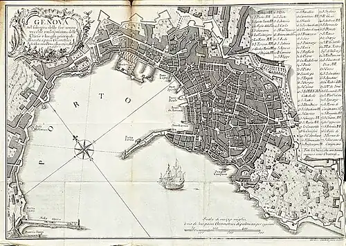 Between 848 and 889 a first new city wall was built, partly with the financial help of the Carolingians, equipped with four gates (Porta San Pietro, Serravalle, Castri and Soprana gates) and four towers (Castelletto, Luccoli, Castello and Friolente), encompassing an area of about 20 hectares.[63] Francesco Maria Accinelli, a Genoese historian of the eighteenth century, reports the expansion of the city wall, with the creation of the four gates, in 925 or, as he reports, according to other sources in 935.[64][65] This did not prevent the city from again falling victim, in the following decades, to assaults by Saracen forces, which in 935 managed to reach and sack even the church of San Siro.[56]