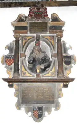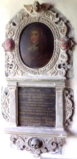 He has long hair and wears the dress of a puritan of the Commonwealth period. His right elbow rests on a skull, a vanitas reference. Pevsner described this monument as "frontal demi-figure, cheek in hand, in an oval niche; deplorably bad".[20] The artistically acclaimed monument to his nephew Charles Cutcliffe (d.1670), survives in the North Aisle Chapel (see under Dennington). The large and elaborate monument to his sister Eleanor Chichester (1629–1681) (mother of Charles Cutcliffe (d.1670)) survives in Ilfracombe Church.