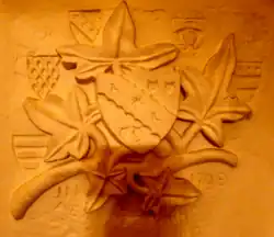 Hearsdon, within the parish of Swimbridge, was anciently a "mansion"[6] and a seat of the Chichester family. A mural monument survives in St James' Church, Swimbridge, to Tristram Chichester (1624–1654) of Hearsdon.[14] He was the second son[15] of Tristram Chichester (1595–1672[16]) (the son of Tristram Chichester[17] (1568–1642[16]) of Hearsdon by his wife Christiana Handford (d.1651) of "Dynnington"[17] in the parish of Swimbridge) by his wife Eleanor (of family unknown) (1603–1647), and was descended from the prominent Chichester family of Hall in the adjoining parish of Bishop's Tawton, itself a junior branch of Chichester of Raleigh, Pilton, near Barnstaple. He married a wife unknown[18] by whom he had four daughters, mentioned in his will but not by name.[17] The monument displays at the bottom the arms of Chichester (with crescent for difference of a second son), impaling the arms of his wife (Sable, a fess vair) and the two arms again on separate shields. Partly behind his head on a smaller shield appear the arms of Chichester impaling: Paly of six argent and gules, on a chief of the second three mascles conjoined in fess of the first (unknown family[19]).