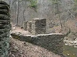 The Marietta Paper Mill was built on the banks of Sope Creek[18] as part of an industrial complex, near where it ends into the Chattahoochee River. The original structures which housed the Marietta Paper Mills were incorporated in 1859. The mills were burned by a detachment of Gen. Kenner Garrard's cavalry division on July 5, 1864. It was rebuilt after the war, the mill burned in 1870. It was restored in 1871, and it operated until 1902.[19] Its ruins are still there, protected by the Chattahoochee River National Recreation Area.[20] Located in Cobb County, it is accessible via two-lane Paper Mill Road, which connects to nearby Johnson Ferry Road. In the west, the road briefly combines with Terrell Mill Road just before ending at Lower Roswell Road as Old Paper Mill Road. Paper Mill Road was carried over Sope Creek by a covered bridge, which was burned by arson in the late 1960s.
