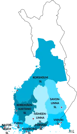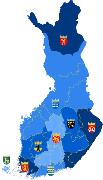 The historical provinces (Finnish: historialliset maakunnat, Swedish: historiska landskap) are former administrative or cultural areas[1] of Finland, with origins from the slottslän (linnalääni) of the Middle Ages.[2] The historical provinces ceased to be administrative entities in 1634 when they were superseded by the counties (lääni), a reform which remained in force in Finland until 1997. The historical provinces play a relatively minor role in popular consciousness,[3] while the modern regions (maakunta, lit. 'province') tend to hold greater significance for regional identity—though this varies across the country.[4]