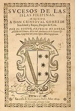Another notable document was Antonio de Morga's Sucesos de las Islas Filipinas published in 1609 based on the author's personal experience and documentations from eye-witnesses of the survivors of Miguel López de Legazpi's expedition.