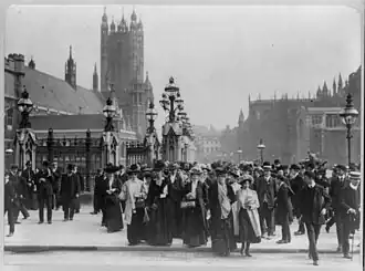 The term “Suffragette” refers specifically to British suffragists who campaigned for the rights of women to vote in public elections as part of militant organisations, such as the Women's Social and Political Union (WSPU).[1] These organisations were formed under the belief that existing legal and constitutional campaigning had achieved little towards the success of the women's suffrage campaign in Britain, and more drastic measures were needed.[2][3][4] Suffragettes, under the motto of “Deeds, Not Words”, engaged in civil disobedience and disruption, smashing windows, exploding letterboxes, cutting telegraph wires and storming parliament in an attempt to oversee the success of their cause.
