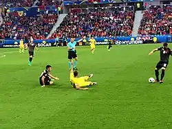 Albania were drawn in Group A, against the hosts France, Switzerland and Romania. Albania lost their opening Game during their campaign with 1–0 against Switzerland to an early header in the 5th Minute from Fabian Schär despite being one man after an Red Card for Lorik Cana Albania held its ground as they came close to an equalizer as Shkëlzen Gashi as he missed an sitter in front of goalie Yann Sommer.[72][73] In the following match they lost 2–0 to the hosts France despite an close fought match being able to defend against the favourites until the last minutes conceding two goals from Dimitri Payet and Griezmann.[74][75] While they beat in the third Group match Romania 1–0 by a header scored from Armando Sadiku before halftime, securing Albania's first ever win in a UEFA European Championship.[76][77] The team finished last among the third-placed teams and were eliminated in the group stage.[78] Finishing their first UEFA European Championship campaign in the 18th place.