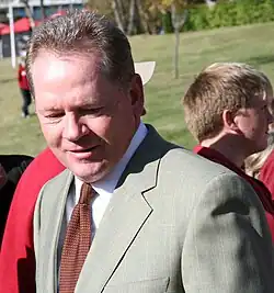 At the time, athletic director Frank Broyles stated that Holtz had resigned and was not fired, but two decades later Broyles acknowledged that Holtz was indeed fired because his actions were negatively affecting the fan base.[112] Holtz would subsequently be hired by Minnesota.[113] Reports also cited his political involvement as a major reason for his firing: controversy arose over his having taped two television advertisements from his coach's office endorsing the re-election of Jesse Helms as Senator from North Carolina at a time when Helms was leading the effort to block Martin Luther King Day from becoming a national holiday.[114][115] Holtz left the program with a mark of 60–21–2.[116] His teams reached six consecutive bowls (1977–1982), but only won one split conference championship. Holtz used a very conservative option offense.[117]