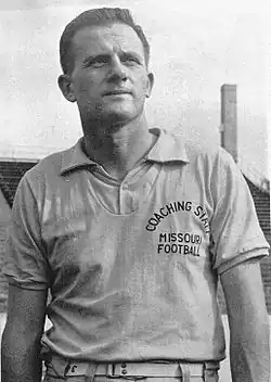 The first University of Arkansas football team was formed in 1894 and coached by John Futrall, who was a Latin professor at the university.[1] That team played three games: two against Fort Smith High School and one against Texas.[1] Before the 1909 season, the teams were called the Arkansas Cardinals and a bird was the school's mascot.[2] The name and mascot changed following the 1909 season when the football team, coached by Hugo Bezdek, finished 7–0.[3] The Cardinals became the Razorbacks after Arkansas defeated LSU 7–0, and coach Bezdek told a group of reporters after the game that his team played like a "wild band of Razorback hogs". The name stuck, and the student body voted to change the mascot.[4][5] The "Wooo Pig Sooie" or "Calling The Hogs" became a tradition and the official school cheer in the 1920s when farmers rushing out to meet the bus returning from an away game called the hogs as a greeting.[6][7][8] Arkansas prevailed over powerhouses Oklahoma, LSU and Washington University in St. Louis in 1909, and was declared unofficial champions of the South and Southwest.[1] It was with the help of Steve Creekmore that this was accomplished. Creekmore became perhaps the first Razorback star, a quarterback from Van Buren who initially played only intramurals.[1] Bezdek used Creekmore to install a very early edition of the hurry-up offense, as the team never huddled and chased the ball after every play.[1] Creekmore was also known for "fast and slippery running, blocking, and passing" and could also return punts and tackle well.[1]