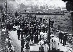 The Asturian working class became organized and in the 1890s, the first socialist groups appeared in Oviedo and Gijón, and somewhat later in La Felguera and Mieres. In 1898, the first anarchist association emerged, and in 1881, the first workers' strike in Asturias took place in the Llascaras and La Moral mines in Langreo.[43] It wasn't until 1901 that a large-scale strike occurred, with workers from El Musel port and supported by those from the Moreda factory, but it was thwarted by pressure from the employers. In 1906, the Mieres factory started another unsuccessful strike. In 1910, Manuel Llaneza founded the Miners' Union (SOMA, in Spanish Sindicato de los Obreros Mineros de Asturias), which became the most powerful union in the region.[44] To counter it, the Patronal Association of Asturian Miners, promoted by the anti-worker Marquis of Comillas, proposed Catholic trade unions, which were not very popular.[43]